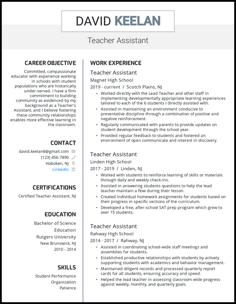 Homeschool teachers provide instruction to students of various ages in their homes. Use this example to guide you when you start creating your own preschool teacher resume: Find out how to professionally format your resume to best showcase your education, experience and competencies relevant to the teaching job opportunity. Preschool teacher resume (text format) text format. Follow these tips to write a standout teaching assistant cv that will show.